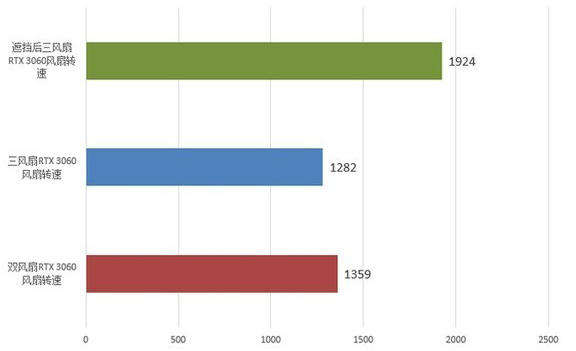 而如果我们将三风扇显卡遮挡一个后,温度大约提升了3℃,再刨去风扇提升的转速,温度大约会提升5℃。